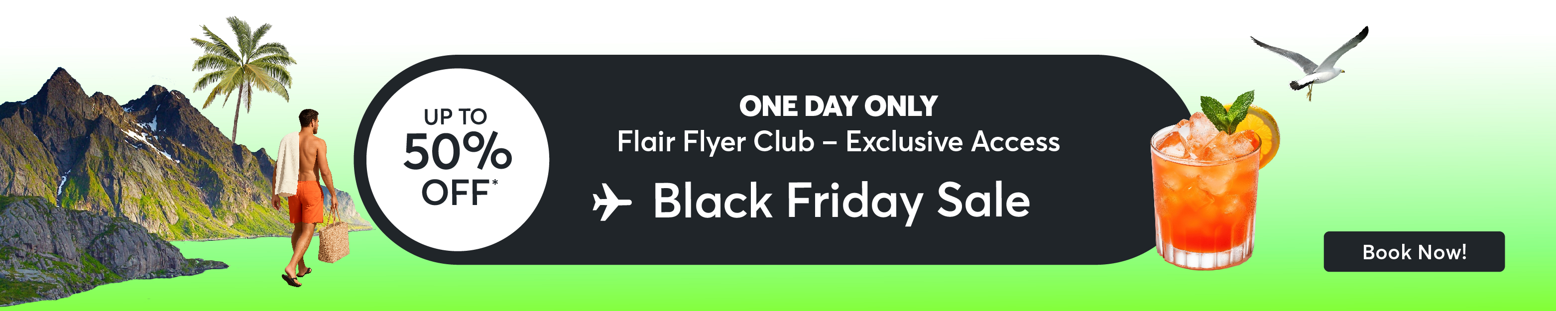 *Fare sale discount: up to 50% off base fare only. Up to 50% off on Tuesdays & Wednesdays, up to 30% off on Mondays & Thursdays, up to 20% off on Fridays to Sundays. Promo code: BLACKFRIDAY50. Book by: 11:59 pm MST 11/26/2025. Travel between: 12/08/25 to 06/10/26. Blackout dates: n/a. Markets: intra AB-BC. Booking class: Bottom 6. Subject to availability at the time of booking.