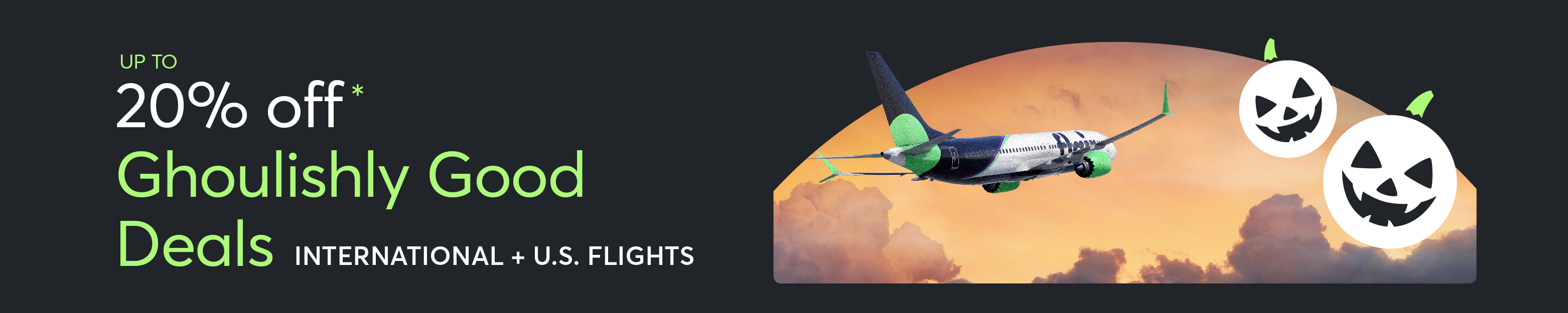 *Fare sale discount: up to 20% off base fare only. 20% off Mondays to Thursdays, 15% off Fridays to Sundays. Promo code: BOO20. Book by: 11:59 pm MST 10/31/2025. Travel between: 11/07/25 to 09/07/26. Blackout dates: N/A. Markets: Transborder & International. Booking class: Bottom 6. Subject to availability at the time of booking.